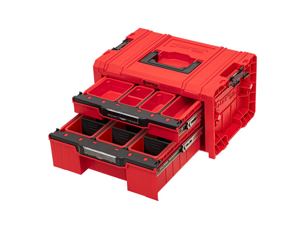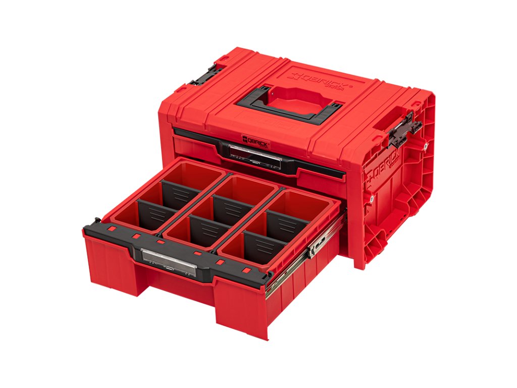Qbrick System PRO Drawer 2 Toolbox 2.0 Expert RED Ultra HD je prostorný, modulární box na nářadí vybaven dvěmi výsuvnými zásuvkami na kovových vodítkách. Aretační tlačítko poskytuje snadný přístup k jejich obsahu. Verze zásuvek Expert je vybavena 5 nastavitelnými přepážkami a 10 červenými boxy (3 nízké přepážky, 7 nízkých boxů; 2 vysoké přepážky; 3 vyoké boxy s děliči), které umožňují organizovat podélné i drobné dílenské příslušenství, šroubky, matky, podložky a podobně.
