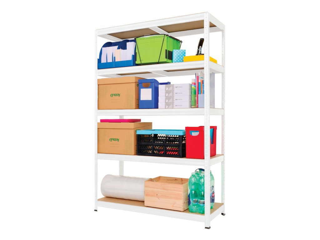Kovový bezšroubový regál FUTUR PLUS, 180 x 120 x 45 cm, 200 kg / pol., 5 MDF polic, bílá