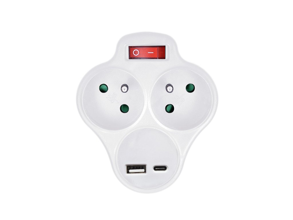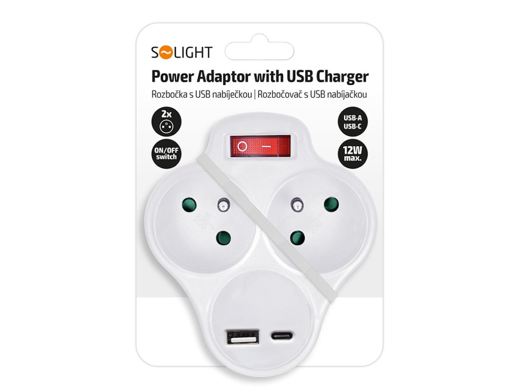 Solight rozbočka s USB A+C nabíječkou, 2 x 10A, bílá, vypínač