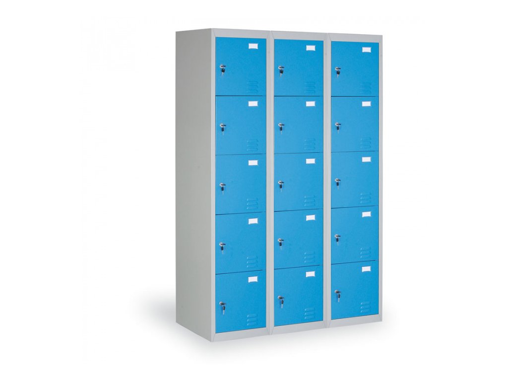 Šatní skříňka s uzamykatelnými schránkami vyrobena z ocelového plechu (tloušťka 0,6 mm). Odolné plechové díly - proti násilnému otevření. Montovaná konstrukce skříňky s pevností jako svařované skříňky.