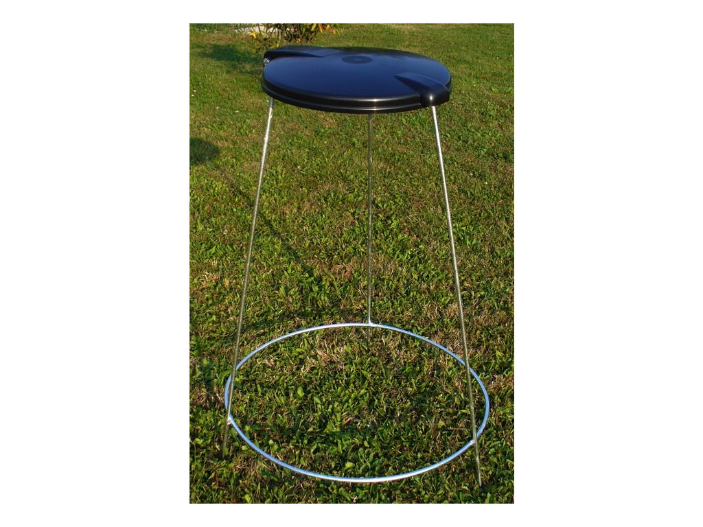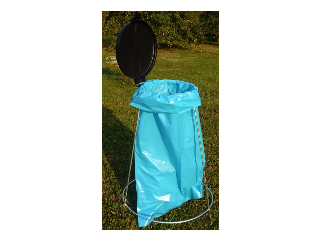 Stojan na pytle v ekonomické, levné variantě. Plastové víko a konstrukce z kulatiny s povrchovou úpravou žárovým zinkováním, která zabraňuje korozi. Pytel o objemu 120 litrů se uchycuje ke koši jeho přehnutím přes horní obruč koše a jeho nabodnutí / uchycení na 3 připravené hroty (viz. obrázek).