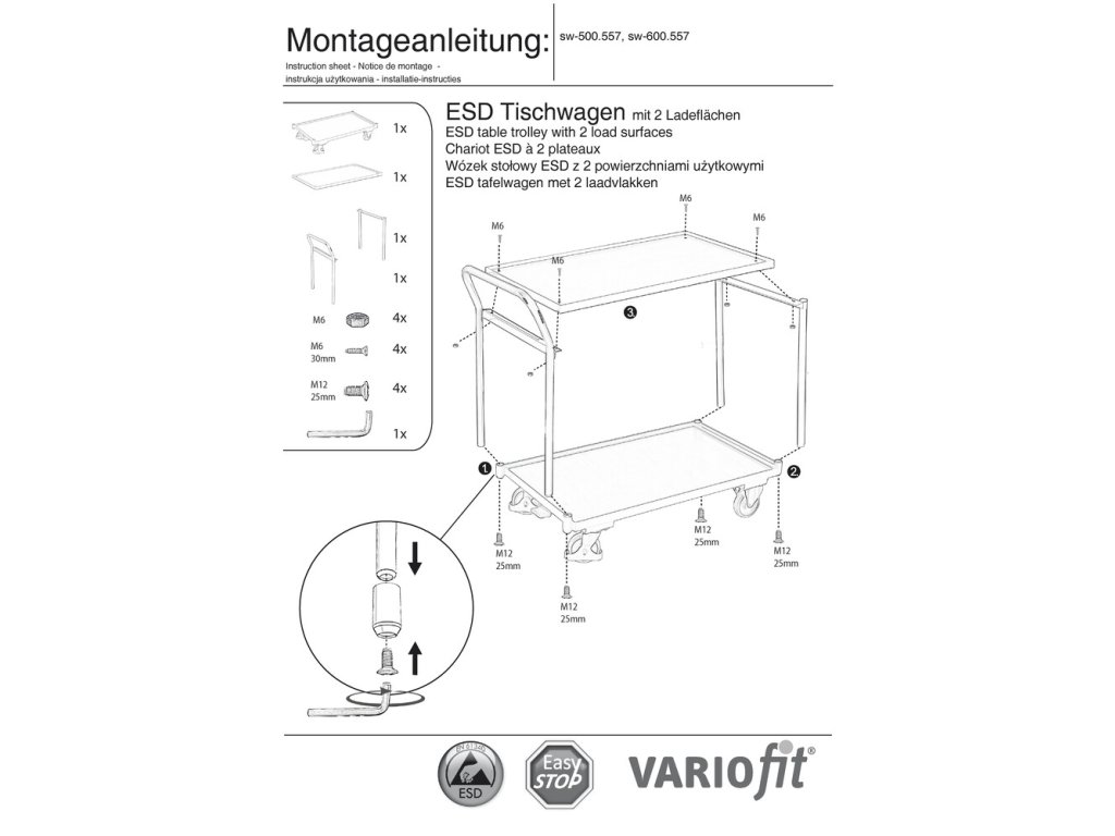 Antistatický policový vozík s madlem, Variofit, 2 police (83 x 49 cm), do 250 kg