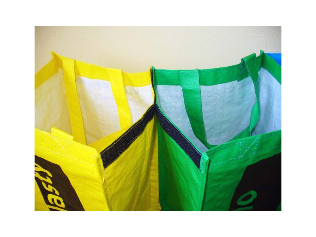 Set 3 tašek z netkané textílie zvýší a zjednoduší proces třídění odpadů v domácnosti. Taška žlutá pro plasty, zelená pro sklo, modrá pro papír. Lze spojovat k sobě podobně jako na obrázku pomocí suchého zipu v horní části tašek.