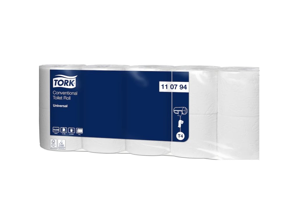 toaletní papír Tork Universal 250 útržků, šířka rolky 9,4cm, délka útržku 13cm, náhrada za 2100 Tork toaletní papír v konvenčních rolích v kvalitě Universal splňuje základní požadavky a pro toalety a umývárny s nízkou návštěvností současně nabízí dobrou kvalitu za přijatelnou cenu. Efektivita nákladů při spolehlivé základní kvalitě.Doplňkové parametry
