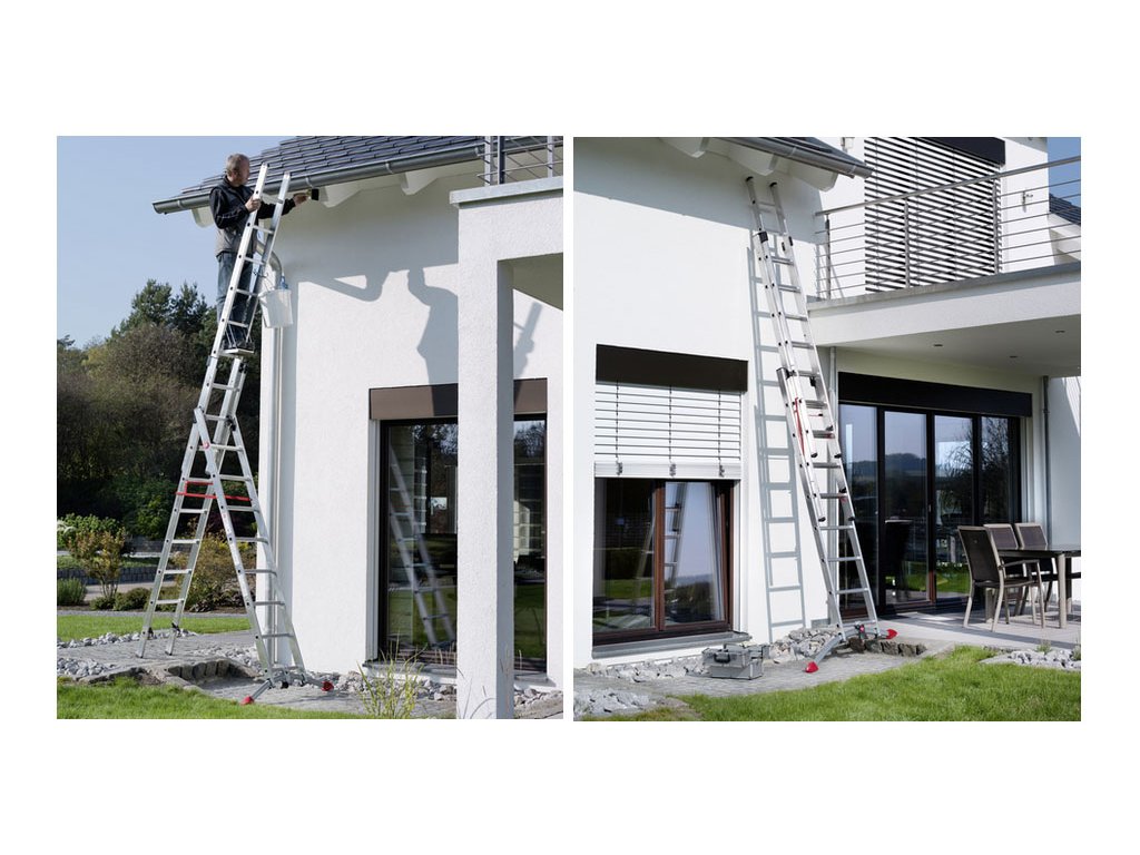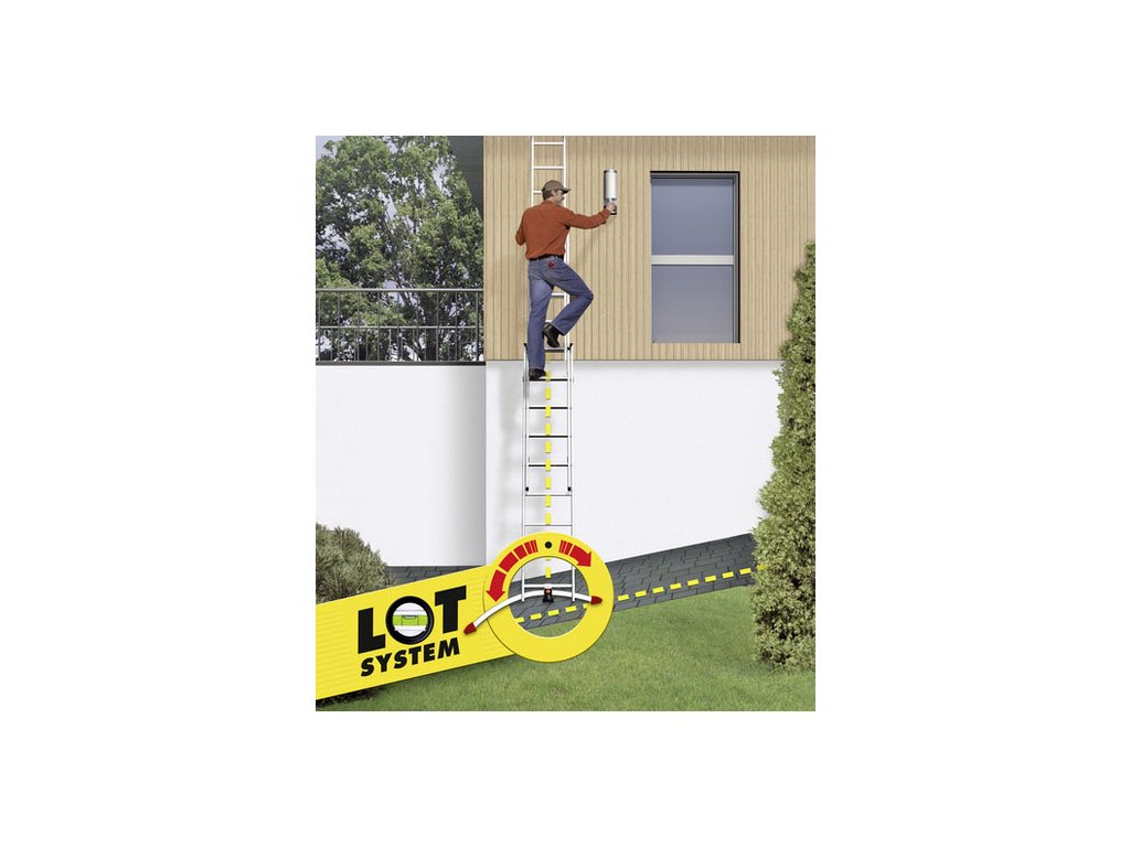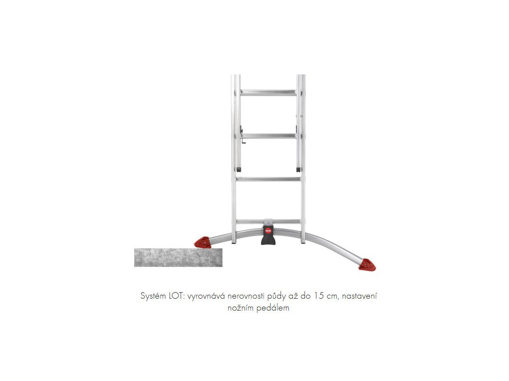 Variabilní hliníkový žebřík. Hlavní znaky: příložný žebřík jednoduchý, dvojitý, nebo volně stojací příčkový žebřík oboustranně schůdný s možností vyrovnání terénních nerovností až do 15 cm (viz foto/video), příčle podélně a příčně profilované, aretační hák se zajištěním pro přepravu, 2 nasazovací nohy s plošnou základnou a 2 tlapové stabilní velkoplošné nohy, systém LOT: vyrovnává nerovnosti půdy až do 15 cm, nastavení nožním pedálem, nosnost do 150 kg.