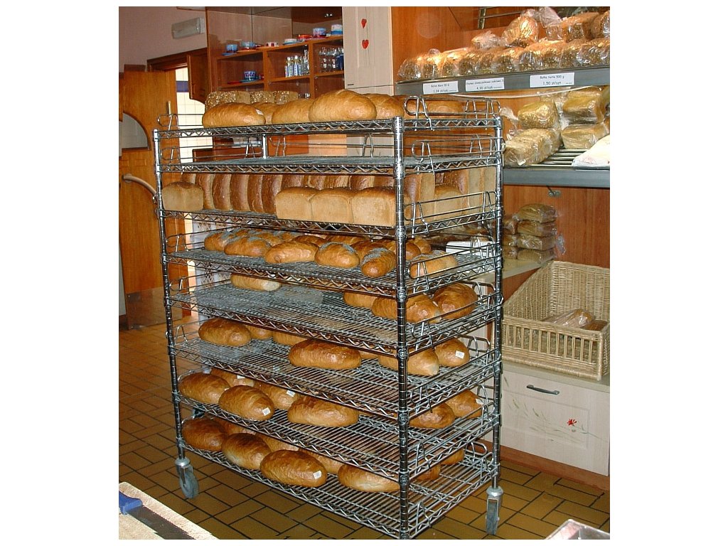 Vhodný především jako potravinářský regál do pekáren pro práci s houskami.