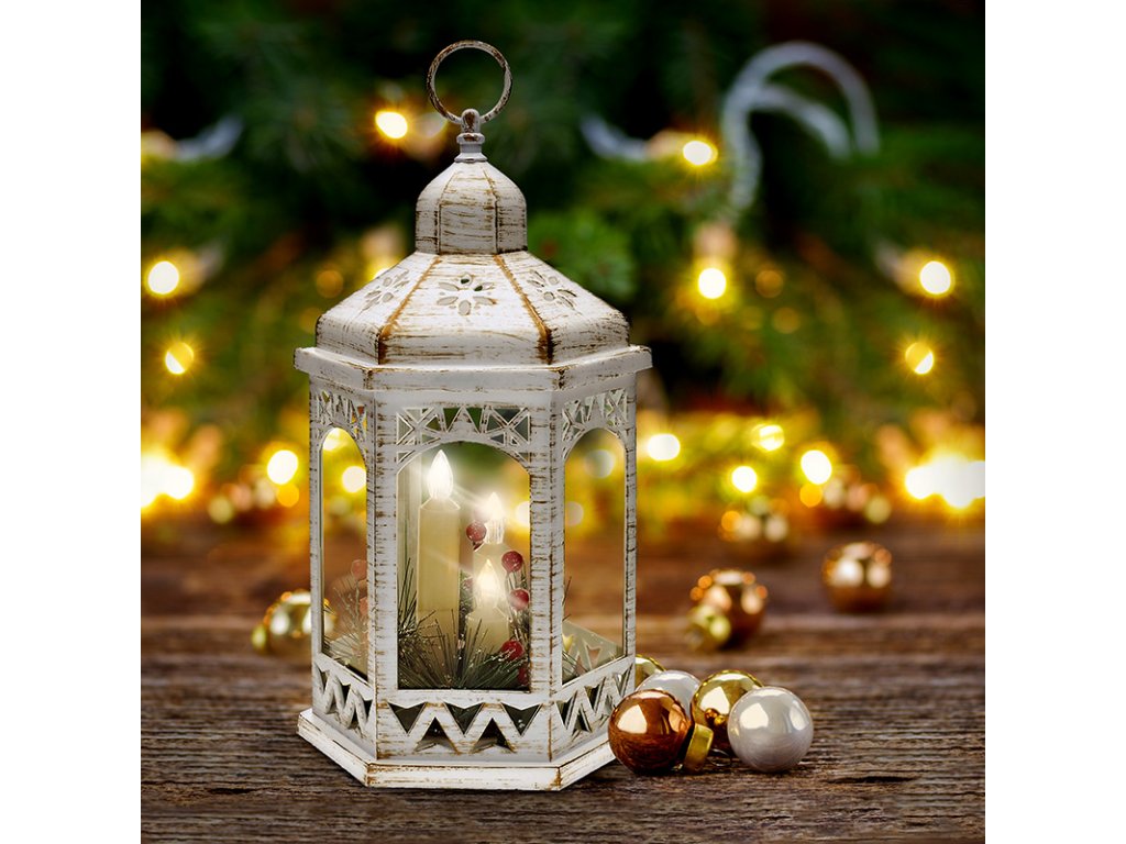 - vánoční lucerna bílá s třemi LED svíčkami a dekoracemi