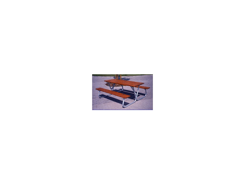 Velice praktický, robustní a odolný set dvou laviček se stolem. Rám vyroben z ocelových trubek Ø 42 mm a L profilu 50 x 50 mm. Celá konstrukce je žárově zinkována, prakticky nezničitelná. Smrkové fošny 120 x 35 mm napuštěné lazurovacím lakem - odstín teak. Ve stoje umístěn otvor pro upevnění slunečníku.