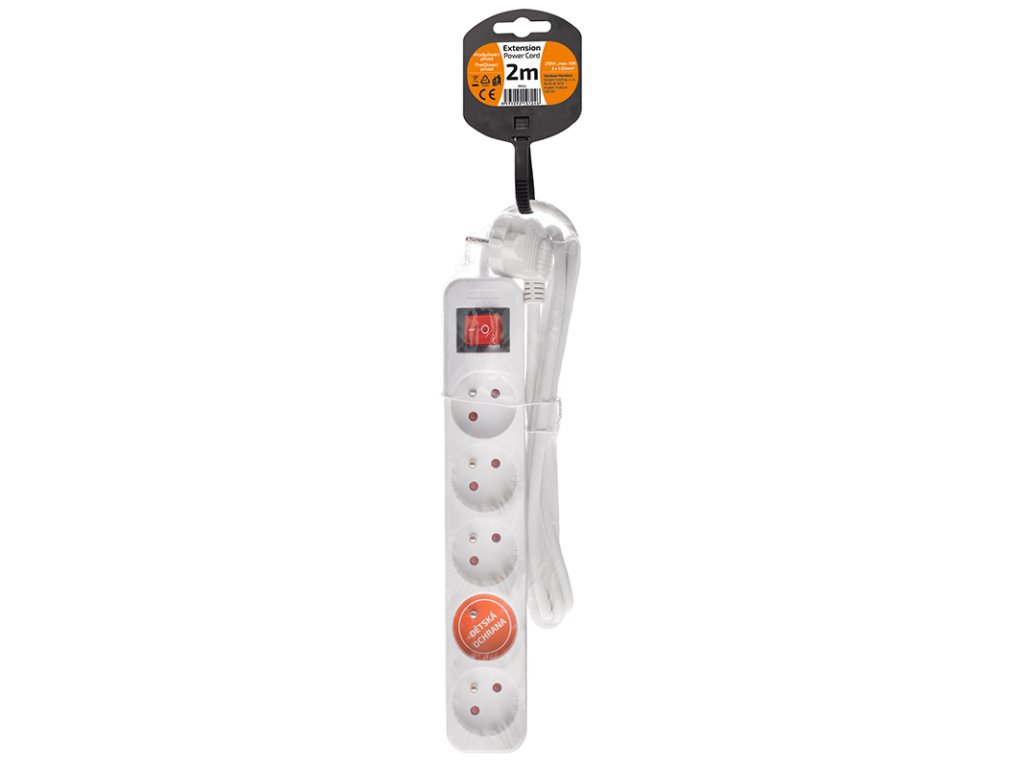 Solight prodlužovací přívod, 5 zásuvek, bílý, vypínač, 2m