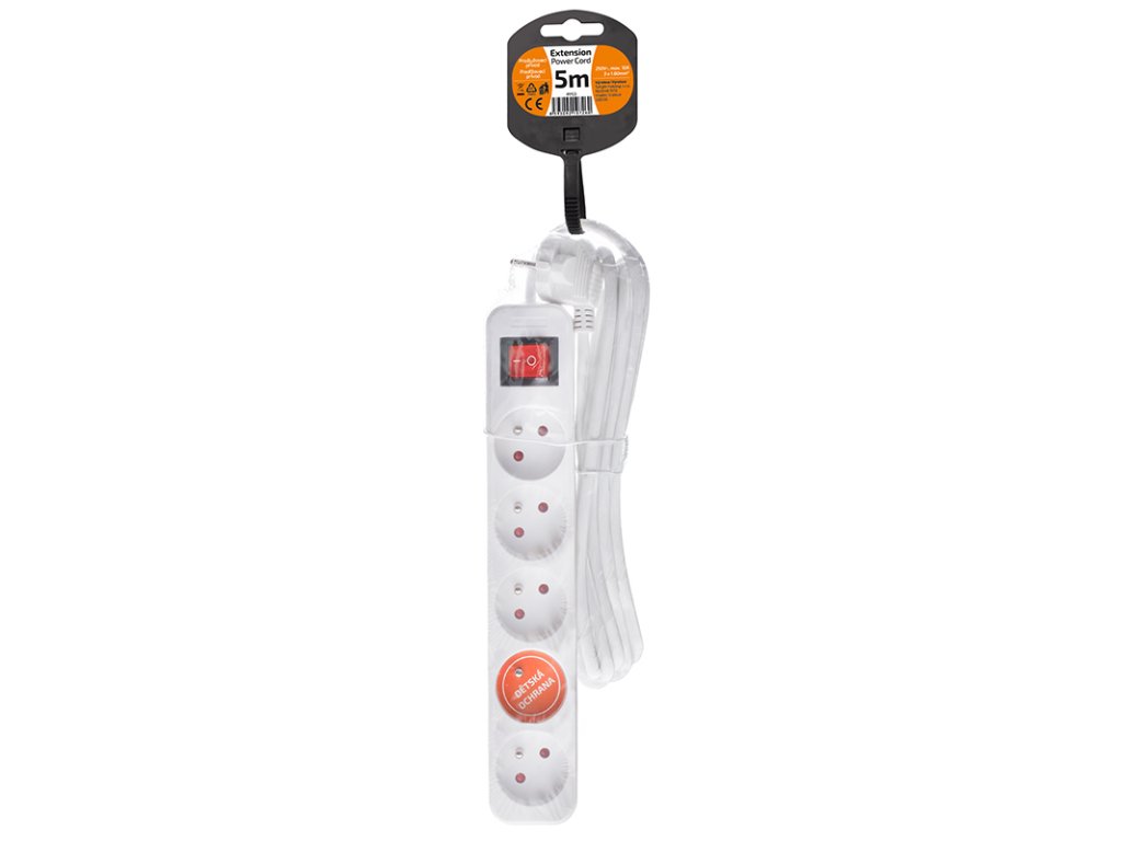 Solight prodlužovací přívod, 5 zásuvek, bílý, vypínač, 5m