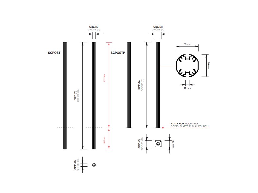 Vitrína nemusí být připevněna na zeď. Můžete ji postavit pomocí speciálních noh do prostoru, nebo kam se nejlépe hodí. Nohy jsou stabilní a určeny pro venkovní vitríny typu L nebo T. Nohy jsou určené pro přišroubování k zemi. Celková výška je 250cm.