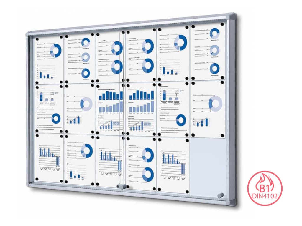 Interiérová magnetická vitrína 18 x A4, posuvné skleněné dveře, protipožární, zamykatelná