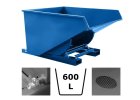 Výklopný kontejner (přepravník) o objemu 600 litrů, varianta s dvojitým dnem a výpustným kohoutem, barva modrá, délka × šířka × výška: 1560x1070x830 mm.