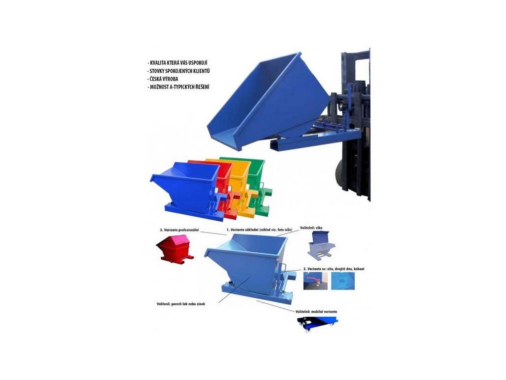 Svařen z plechu tloušťky 3 mm se zesíleným okrajem po obvodu kontejneru. Robustní výklopný mechanismus, který umožňuje vyklopení z místa řidiče vysokozdvižného vozíku pomocí ocelového lanka, po vyklopení se prázdná vana vrátí do původní polohy a automaticky se zajistí. Kontejner musí být při vyklápění z vysokozdvižného vozíku zajištěn řetězem proti nechtěnému sklouznutí z vidlic vozíku. Řetěz i ocelové lanko jsou součástí dodávky. Včetně kapes pro vidlice vysokozdvižných vozíků.