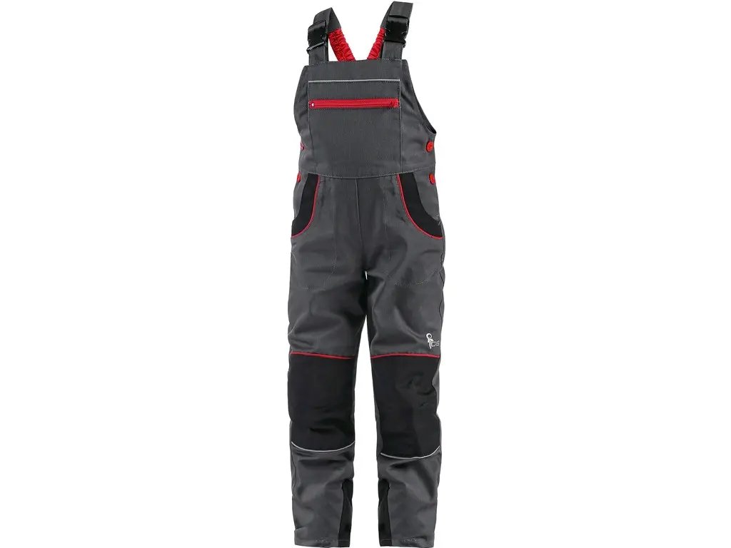 Dětské kalhoty s náprsenkou, z lehkého materiálu, náprsní kapsa na zip, boční zapínání na knoflíky, v zadní části guma s knoflíkem pro přizpůsobení velikosti, přední klínové kapsy, zadní jednoduchá kapsa, zesílená kolena, šle vzadu do gumy, reflexní doplňky.Doplňkové parametry