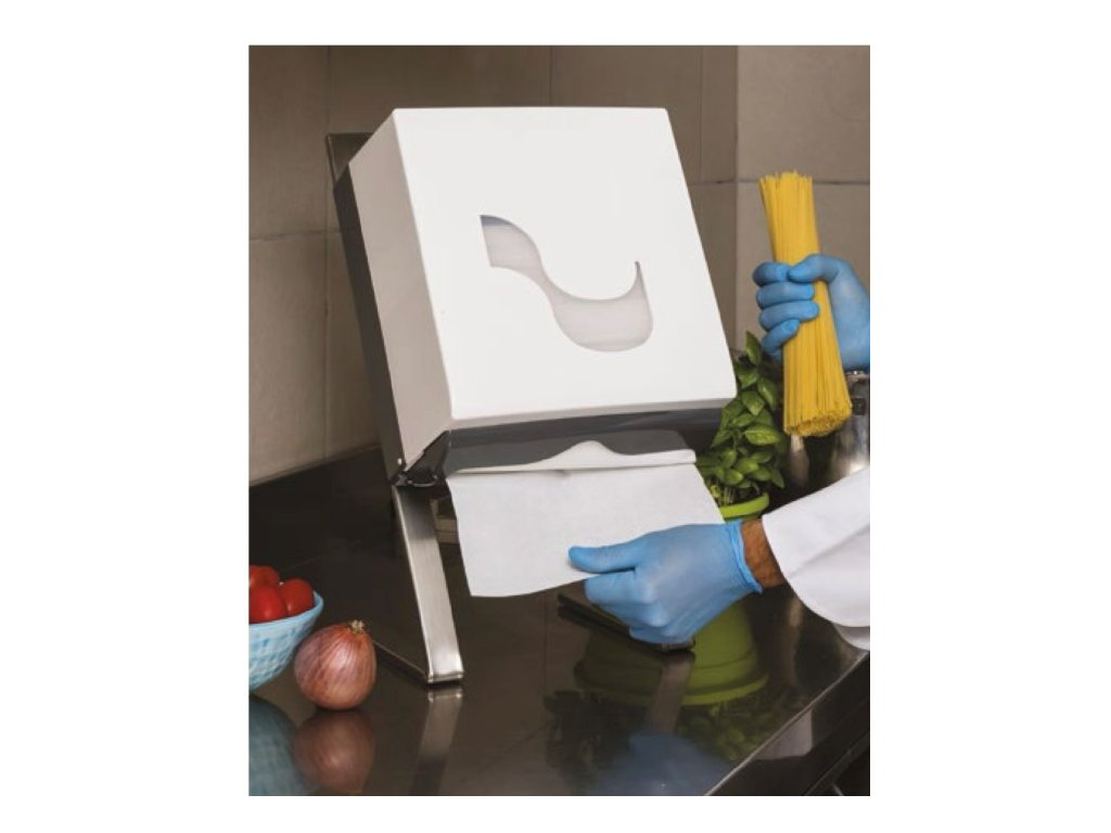 Stolní držák pro zásobník na maxi papírové ručníky skládané CELTEX Omnia Labor Omnia Labor je nový systém z rodiny Celtex Megamini určený nejen pro profesionální kuchyně. Má minimalistický rafinovaný design a inovativní dávkovací systém po jednotlivých listech, který optimalizuje čas a prostor. Skládané listy nahrazují objemné role díky inovativnímu balení maxi, které zaručuje vysoký výkon a nízkou spotřebu v plném souladu s protokoly HACCP. Tato absolutní patentovaná inovace zajišťuje stálou plynulost provozu a zabírá minimální prostor. V souladu s nejnovějšími trendy v restauracích je tento dávkovač skutečným prvkem, který ozdobí i otevřené kuchyně. Omnia Labor je vysoce kvalitní univerzální dávkovací systém, který splňuje všechny požadavky kuchařů. Správné množství papíru je vždy k dispozici, bez zbytečných chyb nebo zpoždění, zamezuje se křížové kontaminaci, protože papír zůstává chráněn. Zásobník je ovladatelný jednou rukou, přičemž každý list je již otevřen. Skládaný ručník maxi velikosti zajišťuje kontinuitu práce.Doplňkové parametry