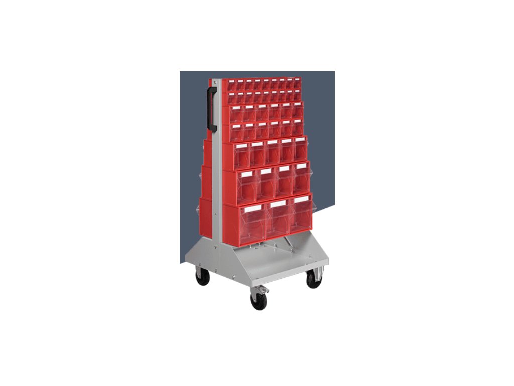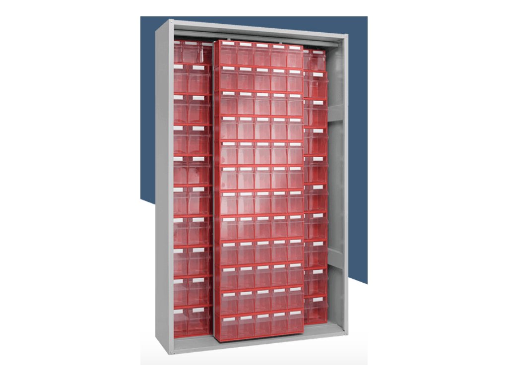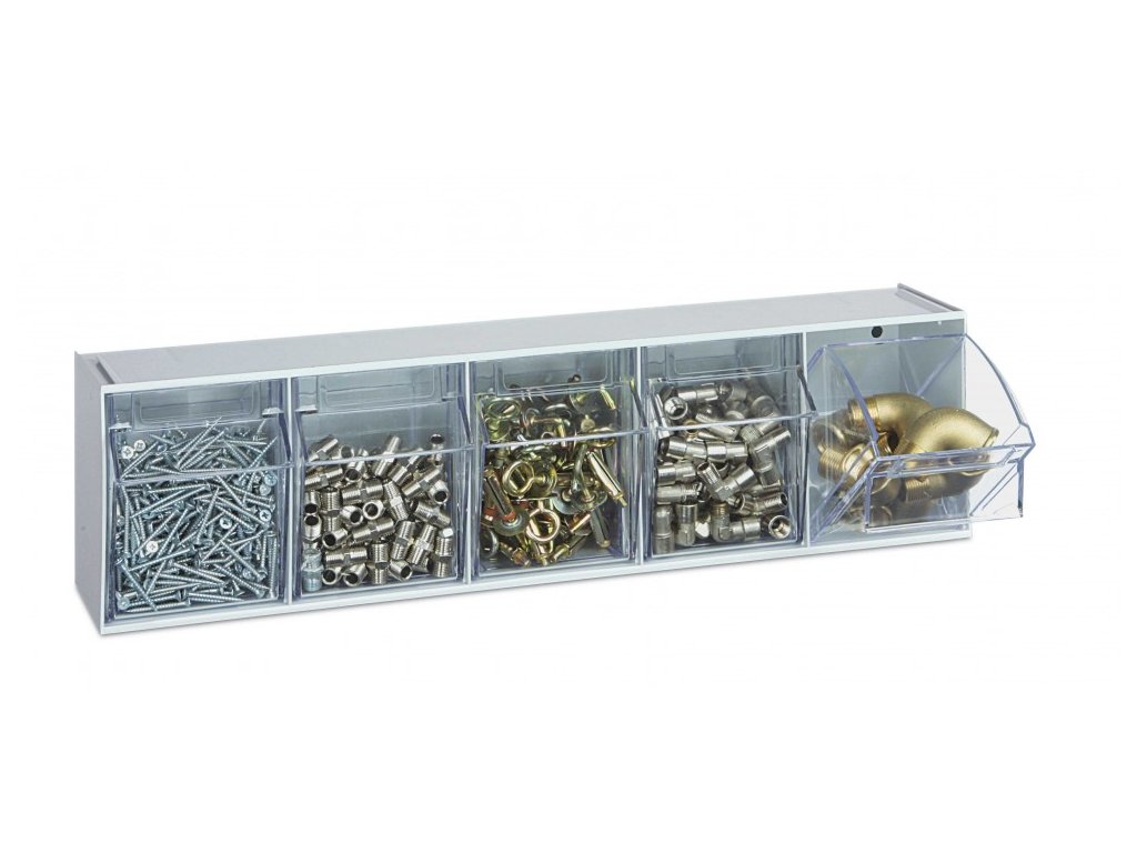 Stohovatelný plastový závěsný zásobník FOX 103 s výklopnými schránkami na úschovu drobného materiálu. Materiál není součástí zásobníku. Zásobníky se dají skládat do modulů.